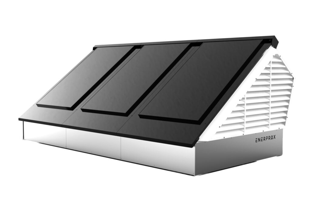 Le Thermo PVT, conçu pour les toits plats, intègre des thermopompes air-eau, des ventilateurs à récupération de chaleur et un système solaire avec batterie.